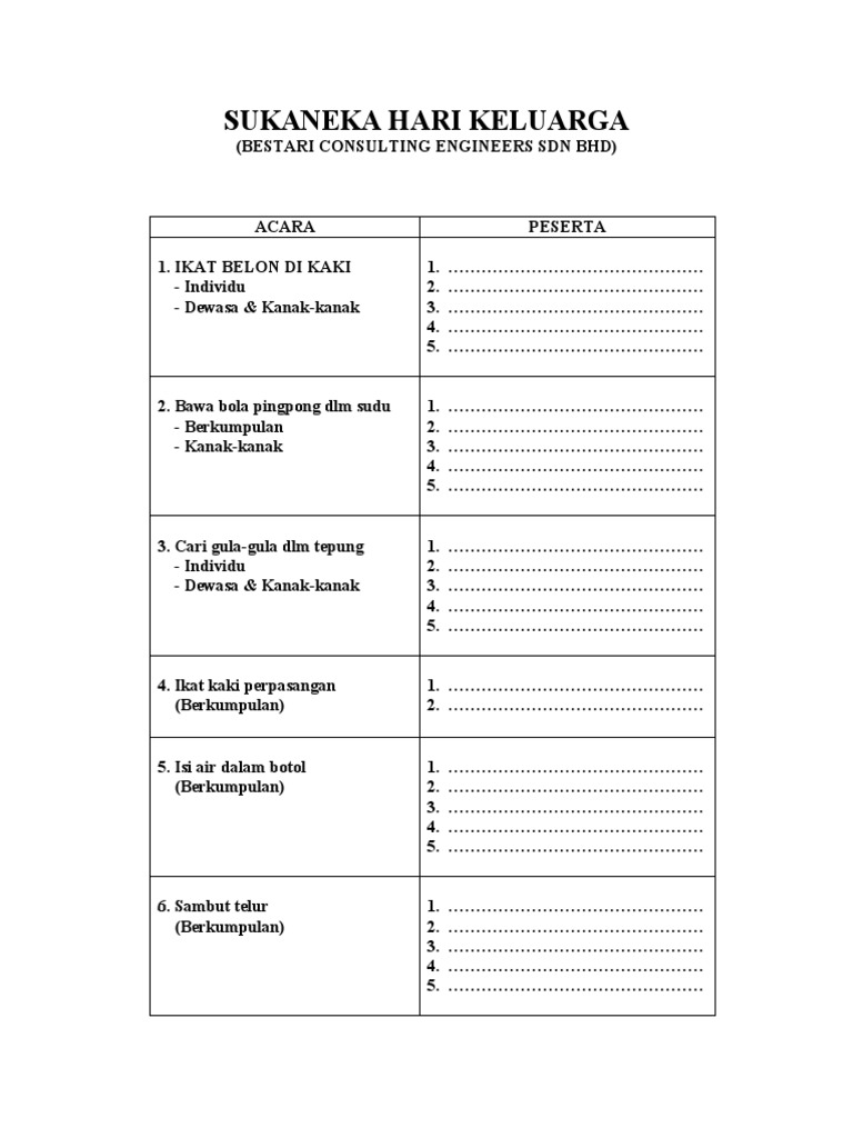 Jarang sekali kita kita berasa bosan pada hari sukaneka. Documents similar to acara sukaneka hari keluarga toman 2015.docx. Sukaneka family day sk perwira 2018 20 21 oktober pulau pangkor. Kalau buat hari keluarga wajib ada sukaneka! Kalau buat hari keluarga wajib ada sukaneka!