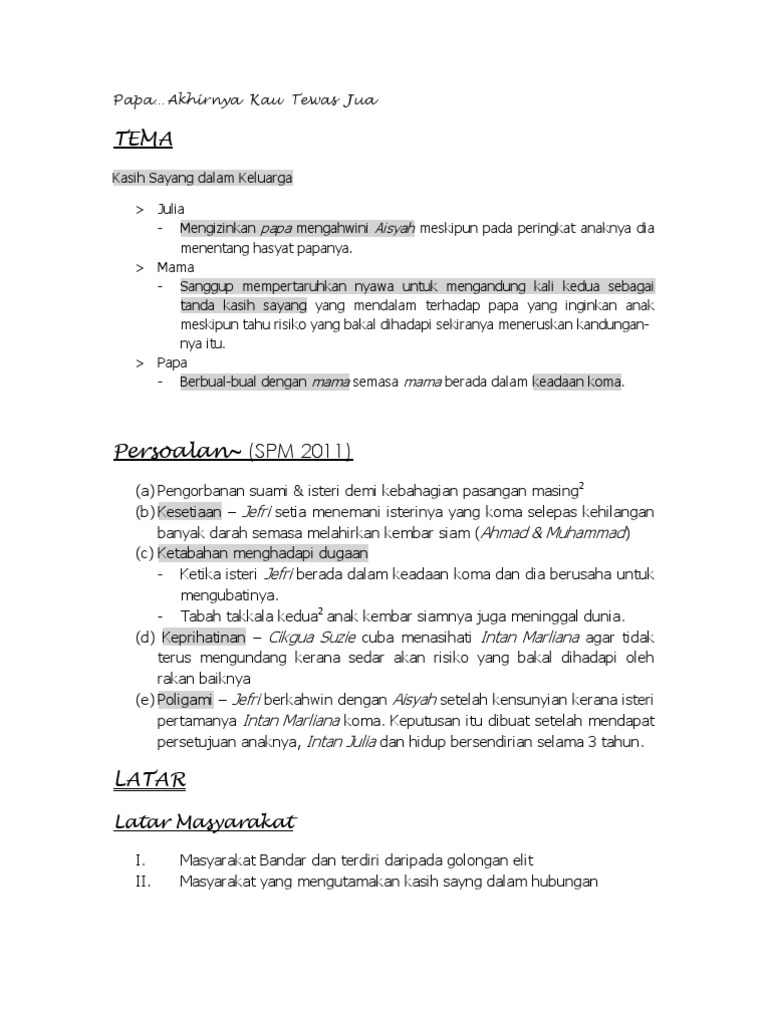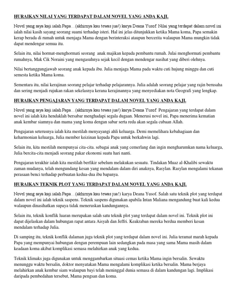 Papa … (akhirnya kau tewas jua!) karya deana yusuf. Dia menyatakan perasaan kurang senangnya apabila melihatkan kemesraan mama dan. Ada perasaan bahagia ngeliat adam akhirnya bisa tidur dan istirahat dengan tenang sambil tersenyum, masyaallah malem ini bobo terakhir kita b3 ya, dam, sama papa. Ikatan itu adalah kunci kepada nikmat kebahagiaan dan keharmonian. Novel yang saya kaji di tingkatan 4 ialah novel papa. Berdasarkan novel papa…(akhirnya kau tewas jua!), huraikan tiga keistimewaan yang ditonjolkan melalui watak utama. Nama sebenar deana yusof ialah norhaiza binti yusof yang dilahirkan pada 3 mac 1957 di kepong, selangor. Start your review of papa. Novel ini bertemakan kasih sayang antara ahli keluarga yang menjadi asas keharmonian sesebuah rumah tangga. Perkenalkan namaku vina, usiaku 16 tahun. Berdasarkan novel papa…(akhirnya kau tewas jua!), huraikan dua peristiwa yang dapat dijadikan ikhtibar kepada pembaca. (akhirnya kau tewas jua!) ialah kasih sayang yang mendalam dalam ikatan kekeluargaan. Sebelumnya, mama sempat menjanda tiga tahun.