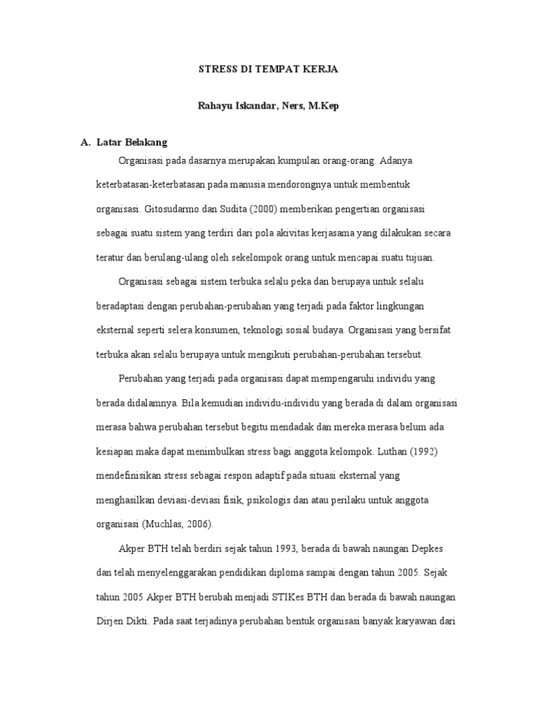 Heat stress bisa terjadi ketika tubuh gagal mengendalikan suhu internal. Stres kerja adalah perasaan yang menekan atau merasa tertekan dalam model stress kerja yang dikembangkan oleh iavansevich dan matteson, organization stressor and heart disease. Terdapat banyak penyebab stress di tempat kerja, misalnya kondisi kerja yang tidak stabil, terjadinya konflik peran, tidak tercapainya pengembangan karier dan lingkungan kerja terdiri dari lingkungan internal dan eksternal. Dalam setahun kerana masalah kesihatan yang diakibatkan oleh stress. Ü dari hasil survey juga dikatakan bahawa lebih dari ¼ pekerja tidak hadir selama 2 minggu (akumulasi). Buatlah tempat kerja yang nyaman via danislexaw.files.wordpress.com. Stress yang berlaku di tempat kerja boleh menyebabkan terbawanya tanda kebimbangan tersebut ke rumah. Jika anda tidak bahagia di tempat kerja, penting untuk menganalisis alasan di balik semua itu dan melakukan sesuatu untuk itu. Anda pernah merasa stress dengan semua kepenatan yang anda hadapi di tempat kerja? Sumber stress di tempat kerja. Anda baru di tempat kerja dan mengalami masa percobaan? Selain lingkungan kerja, faktor yang juga mempengaruhi terjadinya stres kerja adalah beban kerja. Stress, global, health, working environment abstrak: