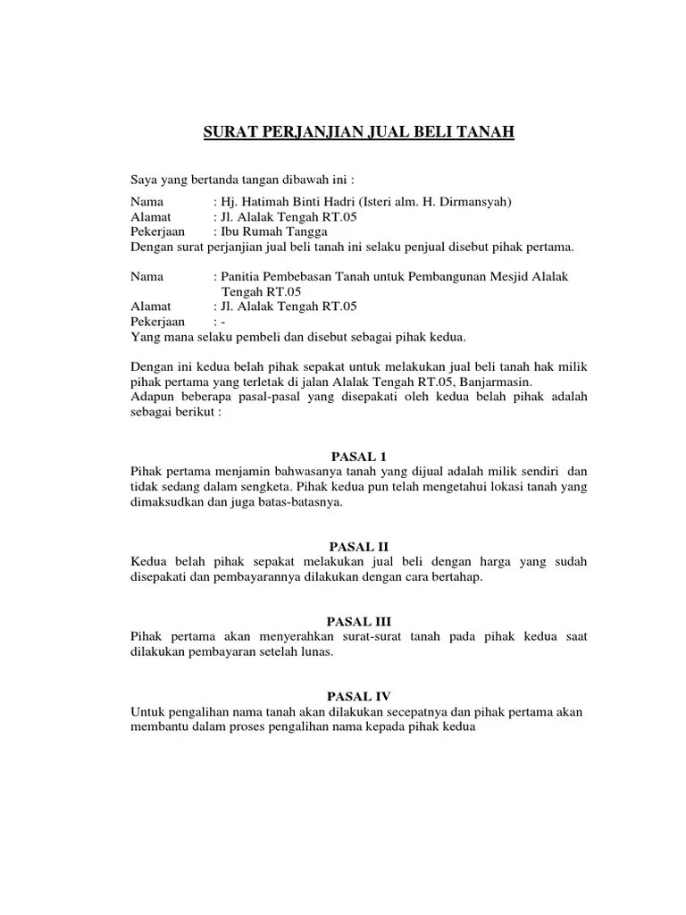 Surat ini bersifat penting karena saat kita telah membeli sesuatu menjadi sebuah bukti yang sah di. Surat perjanjian jual beli tanah. Jual beli objek tanah dalam surat perjanjian diatas telah disepakati bersama dengan harga 750.000.000,00 (tujuh ratus lima puluh juta rupiah). Status kepemilikan terhitung sejak ditandatanganinya surat perjanjian ini maka tanah tersebut beserta segala keuntungan maupun. Surat perjanjian jual beli tanah.