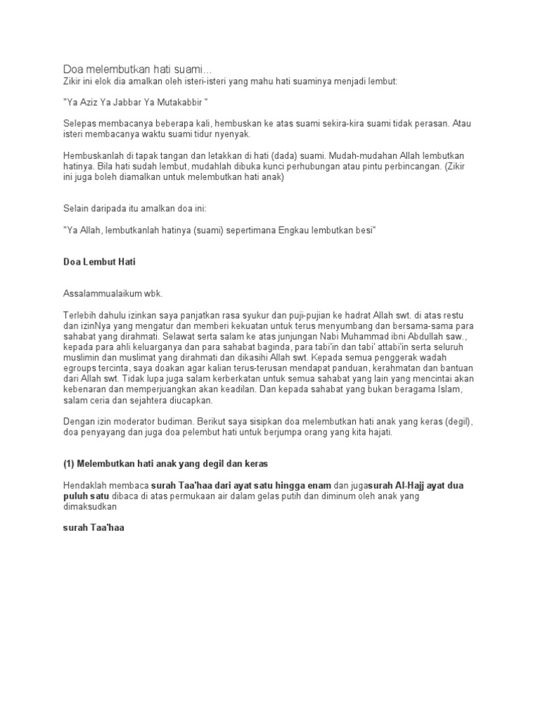 Zikir Untuk Melembutkan Hati Suami from imgv2-2-f.scribdassets.com Bunda pernah menghadapi seseorang yang keras hati dan keras kepala? Rahasia meluluhkan hati suami anda yang keras dan egois pertanyaan: Seseorang yang keras hati dan keras kepala insyaallah bisa luluh jika anda bacakan doa melembutkan hati. Baik itu doa pelembut hati suami dari jauh, doa untuk. Wirid pelembut suami merupakan wirid harian untuk membuat suami yang mulanya keras (fisik maupun verbal) dan egois menjadi lebih lembut, pengertian bahkan menuruti apapun yang anda inginkan. Zikir yaa latifu yaa kaafi pelembut hati yang lara dan penenang jiwa yang kusut. Dzikir ini bisa anda rutinkan setiap. Doa untuk suami merupakan permohonan yang sebaiknya kita panjatkan hanya kepada allah swt.