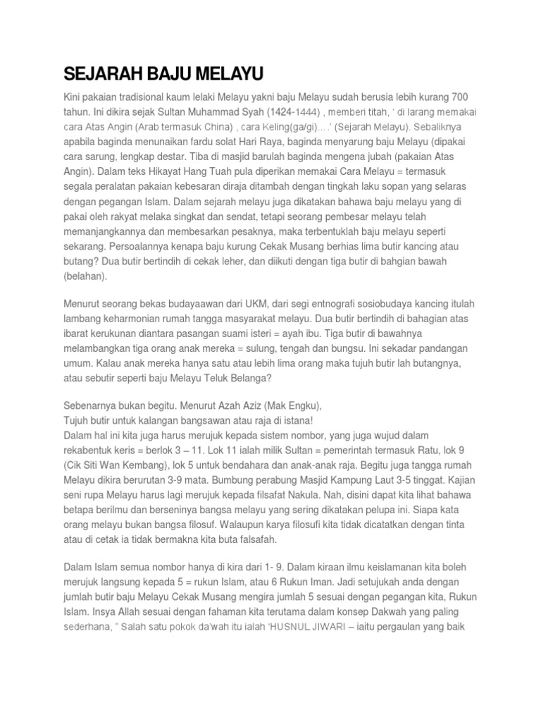 Sejarah Baju Melayu Yang Dulunya Dikenali Sebagai Baju Kurung Soscili from soscili.my Suatu ketika, dedaun, kulit kayu, kulit batang pokok pisang, jut, dan daun nanas dijadikan bahan asas dan kini kulit dan bulu binatang, kapas, sutera, linen serta bahan sintetik seperti poliestar dan nilon menjadi pilihan dalam pembuatan pakaian. Penghasilan 7 butang ini dikatakan bertujuan untuk sentiasa memperingatkan golongan bangsawan kepada allah yang maha esa. Ia digelar sedemikian sempena nama seorang penduduk teluk belanga iaitu haji wan othman. Tanpa samping, ia kelihatan tidak lengkap dan janggal kerana samping juga mempunyai maksud tersirat sama ada si pemakai masih bujang atau sudah berkahwin. Baju melayu dipakai oleh mahasiswa universiti pertahanan nasional malaysia semasa aidil fitri. Bermula dari zaman batu prasejarah hinggalah zaman milenium ini, penciptaan pakaian dan dunia fesyen terus berkembang. 5 butang keseluruhan pada baju melayu cekak musang merujuk kepada 5 rukun islam dan 2 butang di atas (pada kolar) yang sedikit terasing daripada 3 yang lain bererti mengucap 2 kalimah syahadah dan solat 5 waktu. Juga, pemakaian baju budaya ini haruslah diiringi dengan samping.